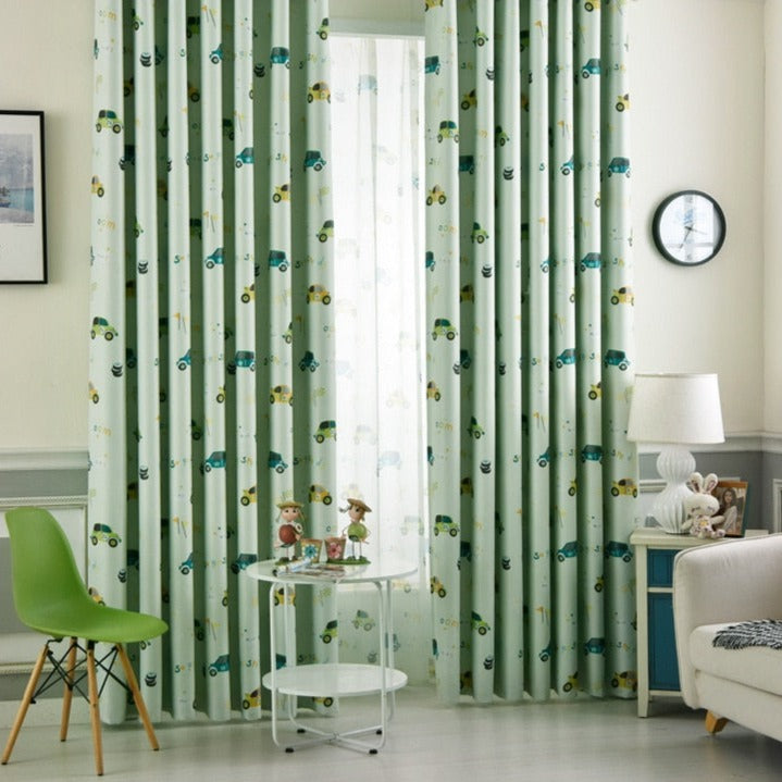 Groen verduisterend gordijn met auto's: Breng Plezier in de Kinderkamer