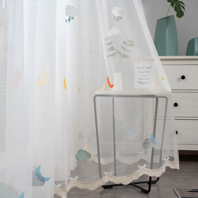 Onze vitrage met geborduurde figuren is de perfecte aanvulling op elke kinderkamer. De zorgvuldig geborduurde details, variërend van schattige wolkjes tot vrolijke halve maantjes en bloemachtige vormen, voegen een speelse touch toe zonder te overheersen. De neutrale basiskleur van de vitrage maakt het eenvoudig te combineren met diverse interieurstijlen en kleurenpaletten. Het fijne kantwerk aan de onderrand voegt een klassieke en charmante afwerking toe, wat de vitrage een tijdloze uitstraling geeft. Laat de verbeelding van je kind de vrije loop met deze unieke en sfeervolle raamdecoratie.