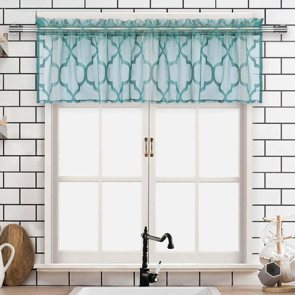 Geef je keuken een frisse en moderne uitstraling met ons prachtige korte keukengordijn. Dit gordijn, met zijn opvallende turquoise kleur en gedurfd geometrisch patroon, voegt direct sfeer toe aan elke ruimte. Het is de perfecte manier om meer privacy te creëren, ongewenste inkijk te verminderen en tegelijkertijd voldoende natuurlijk licht binnen te laten. Stel je voor hoe de zonnestralen zachtjes door het patroon filteren, een speels lichtspel creëert op je aanrecht. Of je nu een landelijke, industriële of moderne keuken hebt, dit veelzijdige gordijn past perfect en maakt van je keuken een nog gezelligere plek.