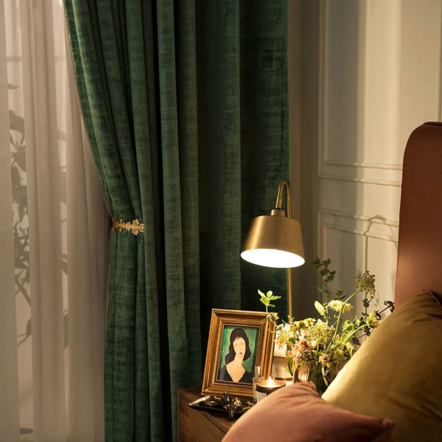 Transformeer je woonruimte in een oase van rust en elegantie met dit prachtige luxe velours verduisterende gordijn. De diepe, rijke groene kleur, geaccentueerd door een subtiel geweven textuur, voegt direct een gevoel van luxe en diepte toe aan elke kamer. Dit gordijn is niet alleen een lust voor het oog, maar biedt ook ultieme functionaliteit door het licht volledig buiten te sluiten. Stel je voor dat je elke ochtend in een perfect donkere slaapkamer wakker wordt, of geniet van een film zonder hinderlijke reflecties. De zachte veloursstof voelt heerlijk aan en draagt bij aan een gezellige en warme sfeer. De stijlvolle gouden bladvormige embrasse (let op: deze wordt apart verkocht) voegt een extra vleugje grandeur toe, waardoor je gordijn prachtig op zijn plaats blijft en een decoratief element op zich wordt. Dit gordijn is de perfecte keuze voor wie op zoek is naar zowel stijl als comfort.