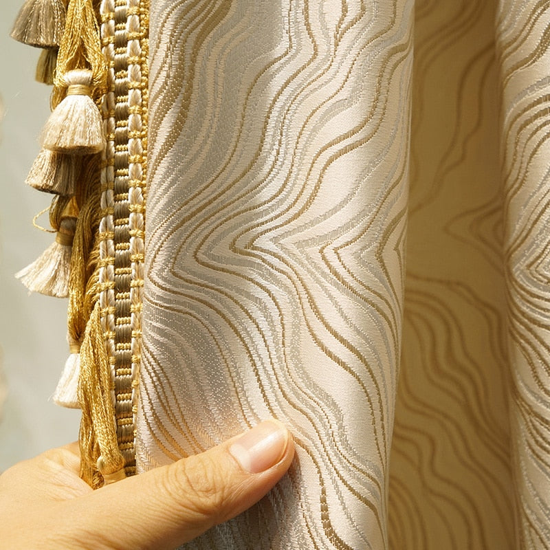 Transformeer uw woonruimte met de weelde van ons luxe verduisterend gordijn in klassieke stijl. Dit prachtige gordijn, met zijn rijke beige en gouden tinten, brengt direct een sfeer van grandeur en verfijning in elke kamer. Stel je voor hoe het zachte licht filtert door de delicate vitrage, terwijl de zware verduisterende stof zorgt voor ultieme privacy en controle over het licht. De handgebonden koorden met kwasten voegen een extra vleugje elegantie toe, perfect voor een interieur dat klasse uitstraalt. Dit is meer dan alleen een gordijn; het is een statement van tijdloze schoonheid en comfort.