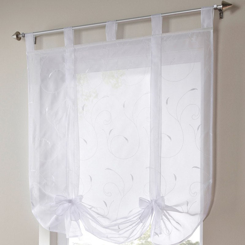 Maak uw interieur compleet met dit betoverende ophaalgordijn vitrage met rode linten.