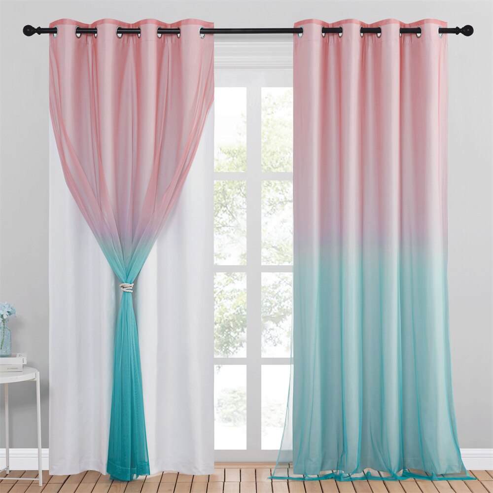 Transformeer elke kamer met ons prachtige verduisterend gordijn met tule kleurverloop. Dit unieke gordijn combineert functionaliteit met een speelse esthetiek, perfect voor wie houdt van een vleugje kleur en stijl. Het dikke, verduisterende paneel zorgt voor optimale privacy en blokkeert ongewenst licht, ideaal voor slaapkamers of ruimtes waar je overdag even wilt ontspannen. De lichtgewicht tule overlaag, met zijn zachte overgang van roze naar turkoois, voegt een dromerige en elegante touch toe. Stel je voor hoe het zachte ochtendlicht door de tule filtert, waardoor een magische gloed in je kamer ontstaat. Dit gordijn is niet zomaar een raamdecoratie; het is een statement dat je persoonlijkheid en liefde voor design weerspiegelt.
