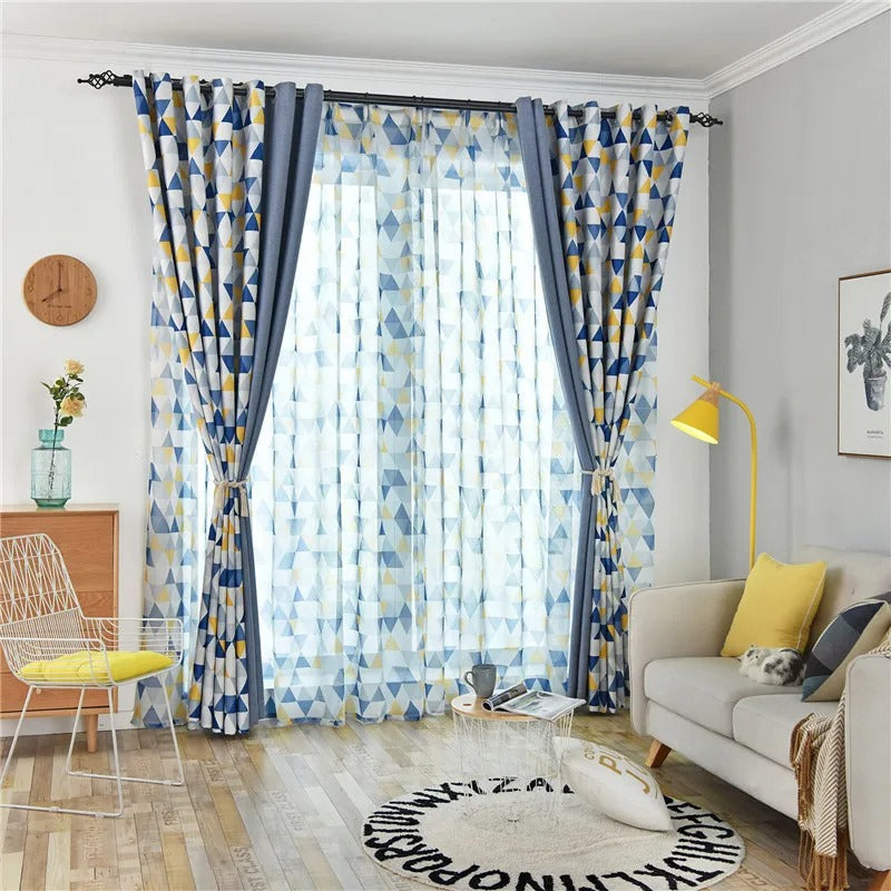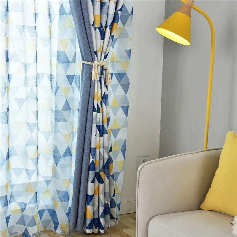 Ben je op zoek naar de perfecte combinatie van stijl en functionaliteit voor je interieur? Dan is dit verduisteringsgordijn met geometrisch driehoek patroon precies wat je nodig hebt. Dit gordijn is niet zomaar een raambekleding; het is een statement dat rust en moderniteit in huis brengt. De speelse driehoeken in blauw, geel en wit creëren een dynamisch en toch harmonieus beeld dat je kamer direct opfleurt. Of je nu je slaapkamer wilt verduisteren voor een goede nachtrust, of je woonkamer wilt voorzien van een frisse, eigentijdse look, dit gordijn is de ideale keuze. Het blokkeert ongewenst licht en biedt tegelijkertijd privacy, terwijl het interieur een unieke en persoonlijke touch krijgt. Stel je voor hoe het zachte licht door de subtiele overgordijnen filtert, terwijl de dikke gordijnen zorgen voor een serene sfeer wanneer jij dat wilt. Dit gordijn is meer dan alleen een product; het is een uitnodiging om je huis om te toveren tot een plek van comfort en stijl.