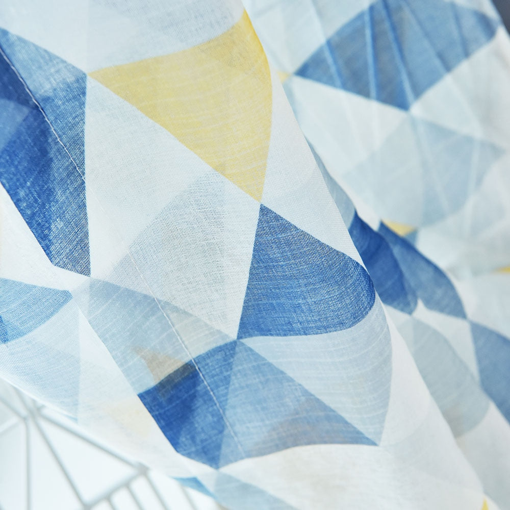 Geef je interieur een frisse en moderne uitstraling met onze prachtige vitrage met blauw geel geometrisch patroon. Dit luchtige gordijn is perfect om je kamer op te fleuren en tegelijkertijd te genieten van voldoende daglicht. De levendige kleuren blauw en geel, gecombineerd met het speelse driehoekige patroon, creëren een dynamische en uitnodigende sfeer in elke ruimte.