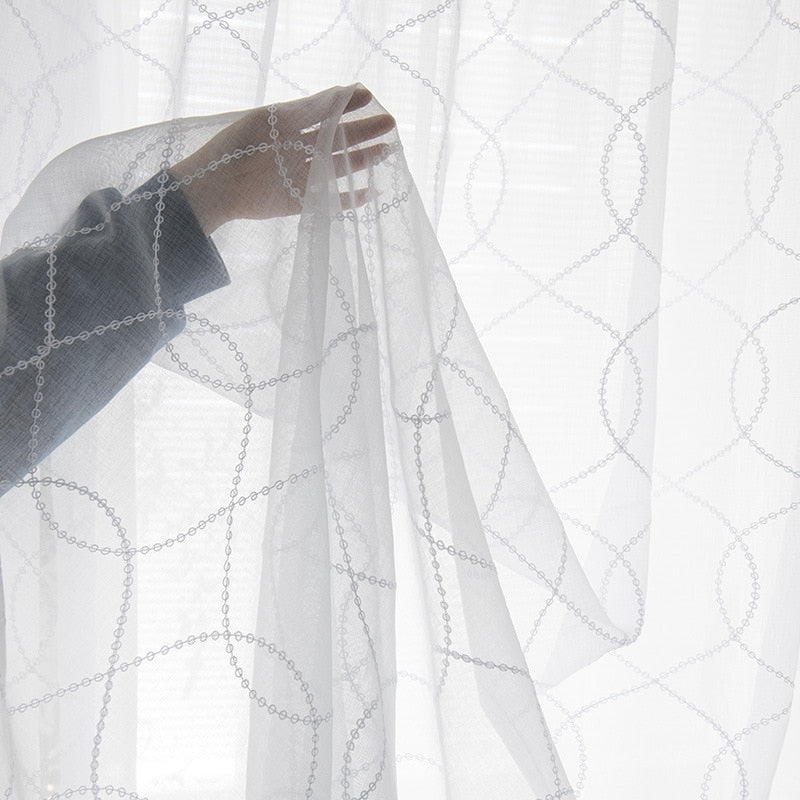 Ben je op zoek naar een frisse en moderne toevoeging aan je interieur? Dan is onze witte vitrage met geometrisch patroon precies wat je nodig hebt! Deze vitrage, subtiel doorschijnend zoals te zien op de afbeelding, laat voldoende natuurlijk licht binnen terwijl het toch privacy biedt. Het delicate patroon van in elkaar grijpende cirkels geeft een eigentijdse draai aan je ramen, perfect voor elke kamer in huis, van de woonkamer tot de slaapkamer. Laat je inspireren door de lichte en luchtige sfeer die deze vitrage creëert en transformeer je huis in een oase van rust en stijl.