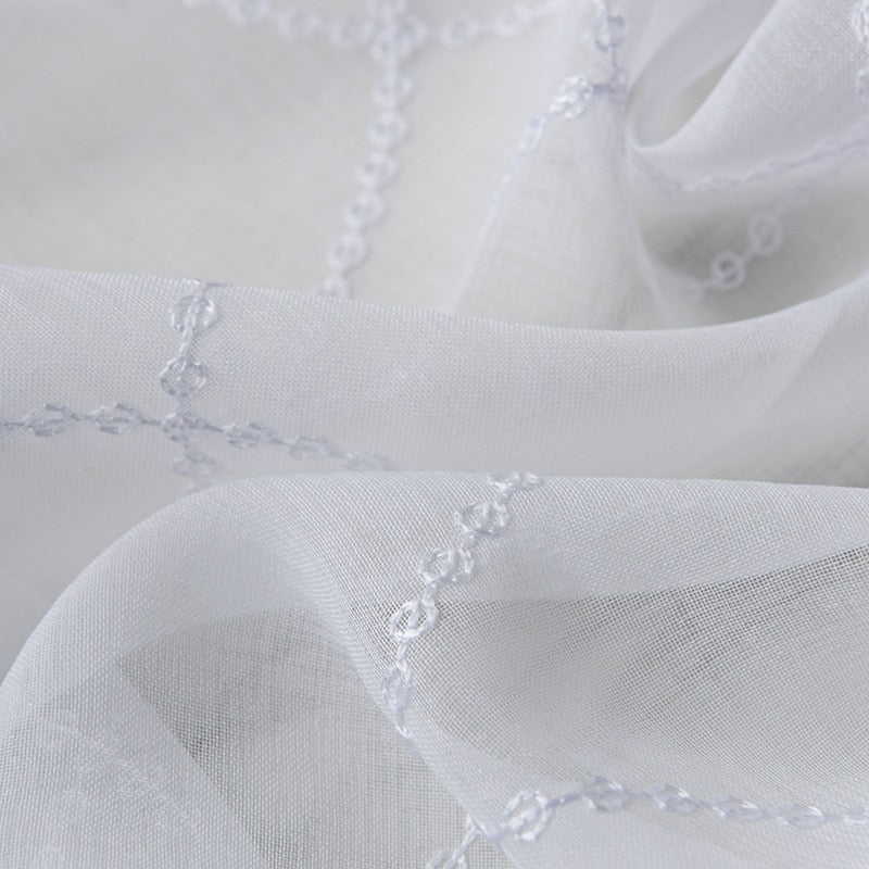 Verbeeld je hoe de zonnestralen zachtjes door het fijne geometrische patroon van deze witte vitrage vallen, en je kamer vullen met een warme, uitnodigende gloed. Deze vitrage is niet zomaar een raambekleding; het is een statement van elegantie en moderniteit, dat je interieur direct naar een hoger niveau tilt.