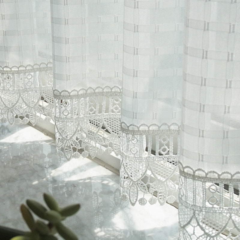 Geef je ramen een frisse look met deze witte vitrage met kant en ruitpatroon.